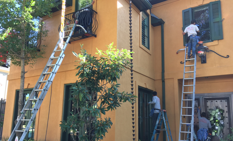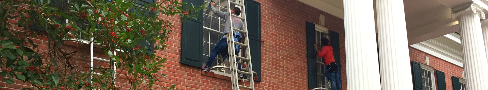 Our crew working side by side to avoid skipping or missing a window. The red brick house on the right has dormer windows that have never been cleaned simply due to the lack of equipment needed to reach it. Not to worry, as you can see our ladders have no problem reaching 3 story heights.