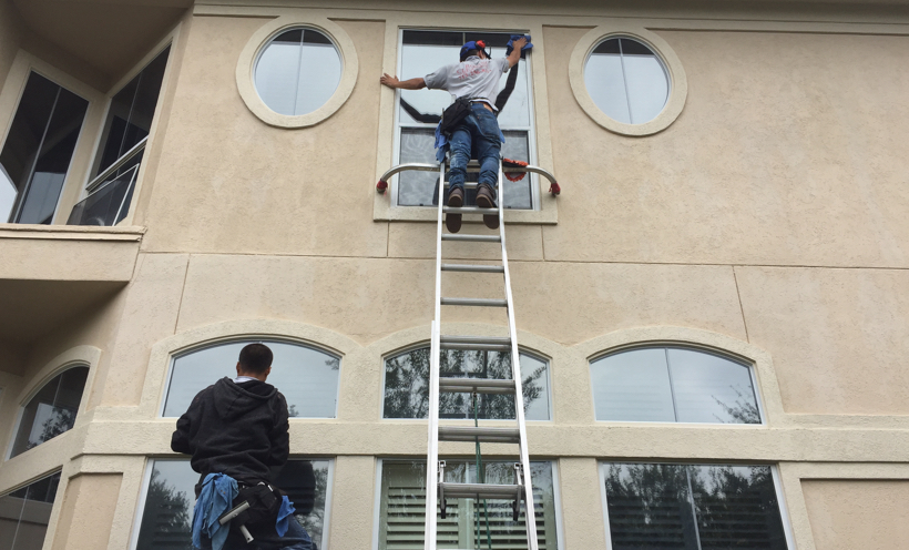 Working together is key to maximizing productivity and efficiency. Our 2 guys here working together followed by the checking of each other’s work after the cleaning has been completed. Our tool belts allow us to carry multiple surgical rags at once, rather than using the same dirty ones on multiple windows. This method increases productivity and allows us to continually work with clean rags.